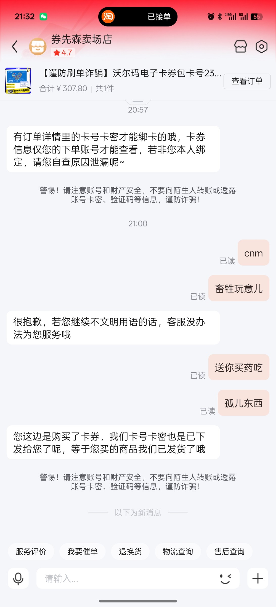 以后买大额卡密,记得录屏,从支付开始录,商家把卡密信息发过来直接去官网查询,查询绑定使用了,直接把视频给客服发过去,这种包退,他们也没办法,毕竟咱们是真的在官网查询的